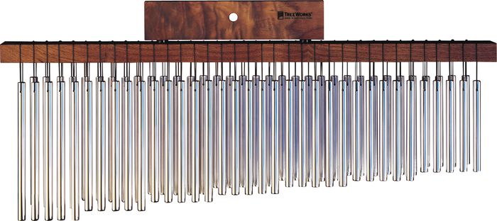 The TreeWorks double-row ZenTree Chimes move in tiered or stair-stepped groups of chimes instead of normal tuning with a gradual change in pitch from bar to bar. This tuning creates a soothing and mystic sweep with a nice tension and release when played from high to low. The bars are crafted from a TreeWorks, chime specific aluminum/titanium alloy. The chime bars are polished and heat tempered for brilliant tone. Each chime is individually hand-tied with 50-pound braided CordLoc. No plastic ties are used. The ZenTree Chimes' mantle is hand-finished Tennessee Black Walnut.